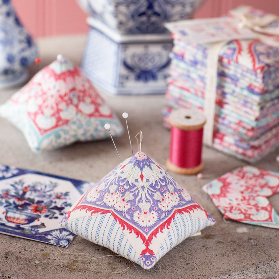 These pincushions are fun small hand sewn projects where we have used the more ornamental fabrics from Bon Voyage. The top fabric is fussy-cut to create a distinctive ornament on top of the pincushion. The explanation is now available under Free Patterns.