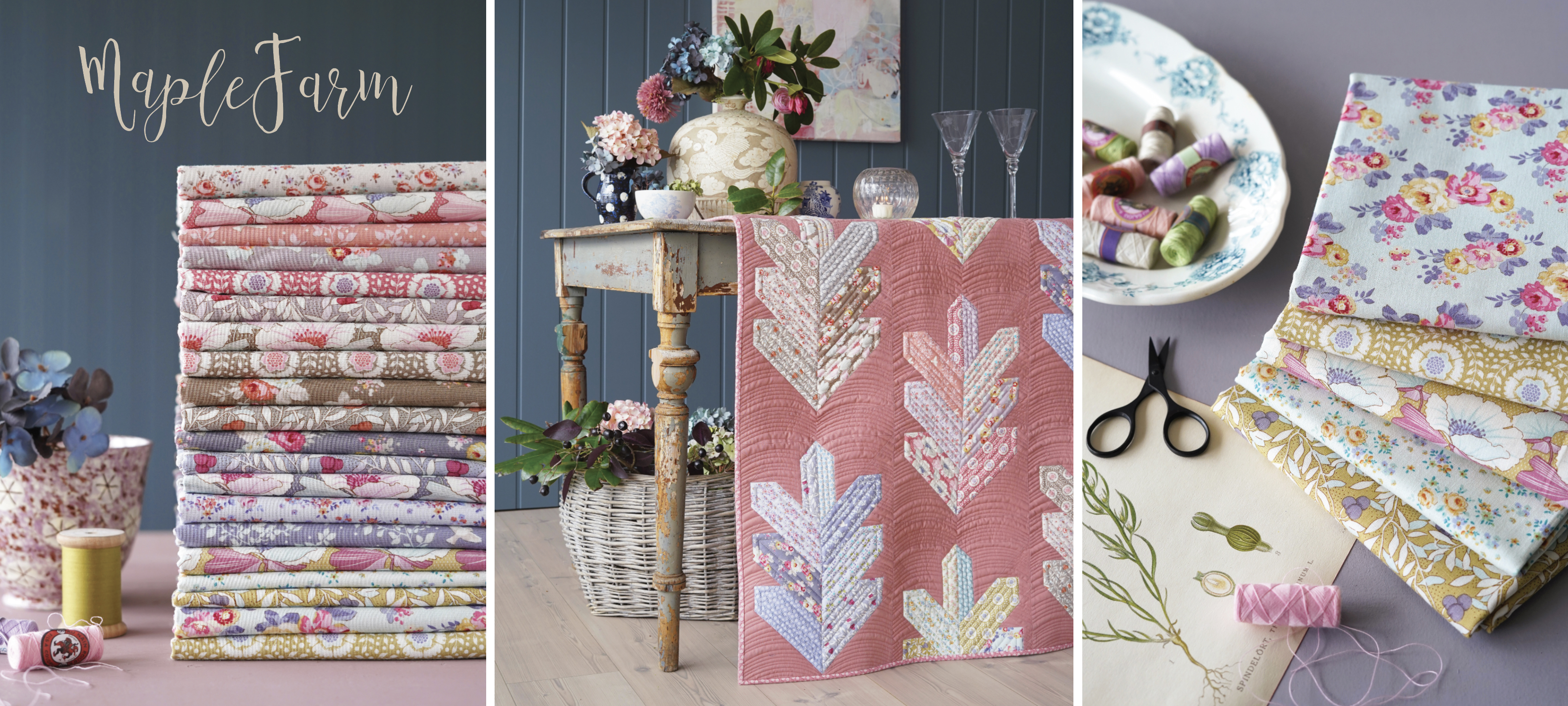 With beautiful, earthy fall pastels and a mix of patterns, Maple Farm is a versatile collection perfect for soft autumn quilts. Berries and leaves mixed with classic and retro florals in toned-down shades such as Umber, Slate, Dijon, Mauve and Rosehip give the collection a romantic farm look that inspired its name. Four new muted Solid Basics are a wonderful match for this and many other Tilda collections.