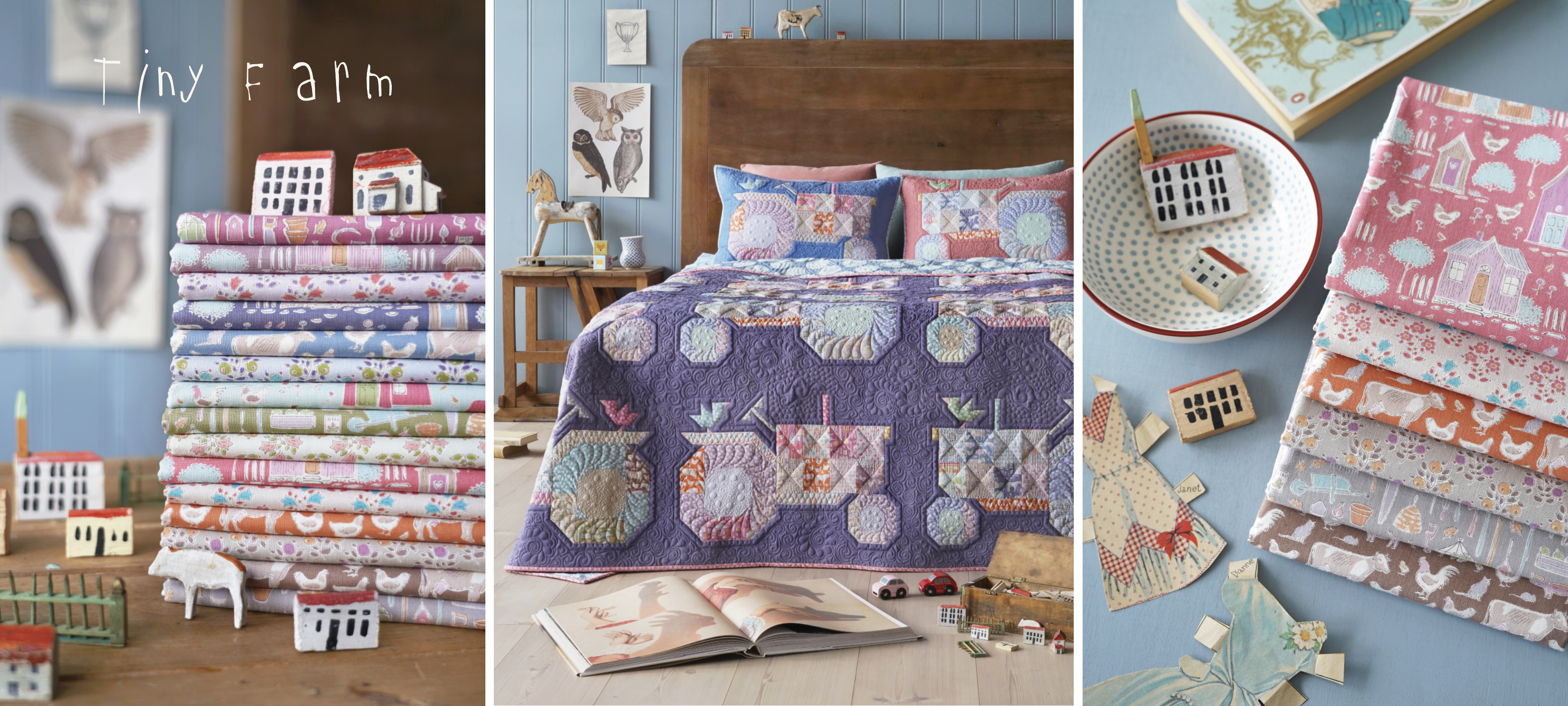 The farm theme also gave inspiration to a charming extra collection called “Tiny Farm“ with a hand drawn farm, animals, tools, flowers and berries, optimally suited for projects for children. The flower and berry fabrics from Tiny Farm are also perfect blenders for Maple Farm.